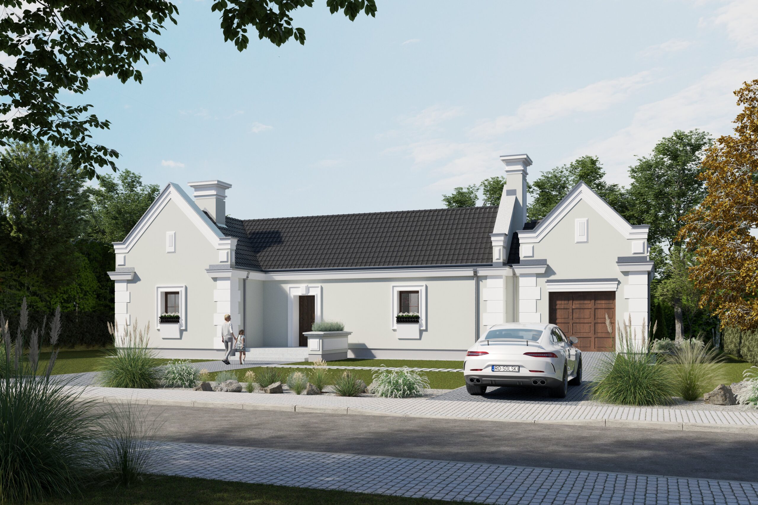 Elewacja proponowana w wariancie 1 posiada elewację otynkowaną. Otynkowane są również wszystkie detale architektoniczne widoczne na narożnikach budynku, nad oknami, drzwiami czy garażem. Detale wykonane są ze styropianu zbrojonego siatką powlekanego masą kompozytową i wykończone farbą. Istnieje możliwość wyboru formy wykończenia detali (boniowanie lub pilaster).Okna posiadają szprosy, które nadają lekkości i stylu. Pięknym dopełnieniem elewacji tylnej jest drewniany wykusz, inspirowany stylem architektonicznym epoki wiktoriańskiej.